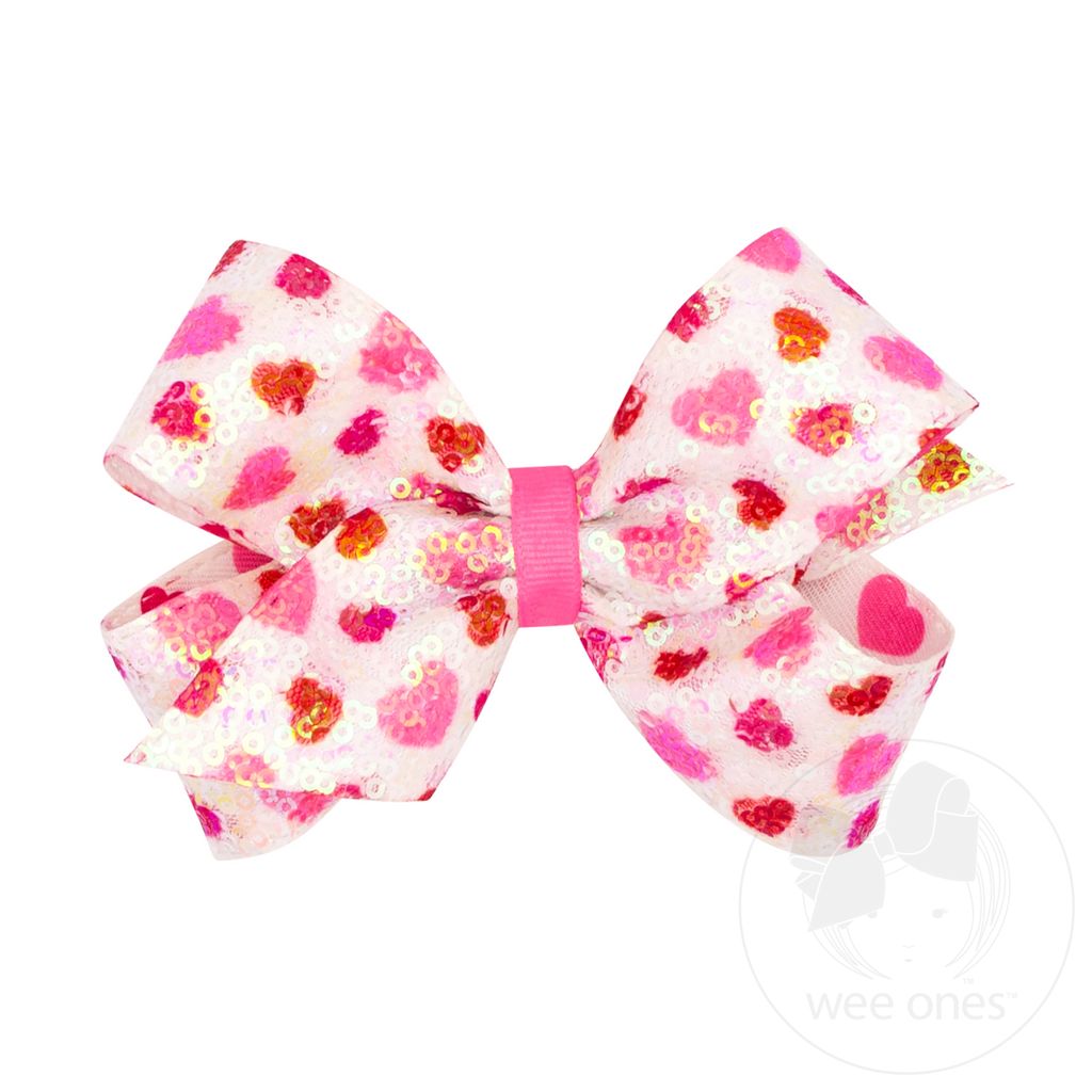 Medium White Valentine Sequin Hair Bow with Red and Pink Heart Print