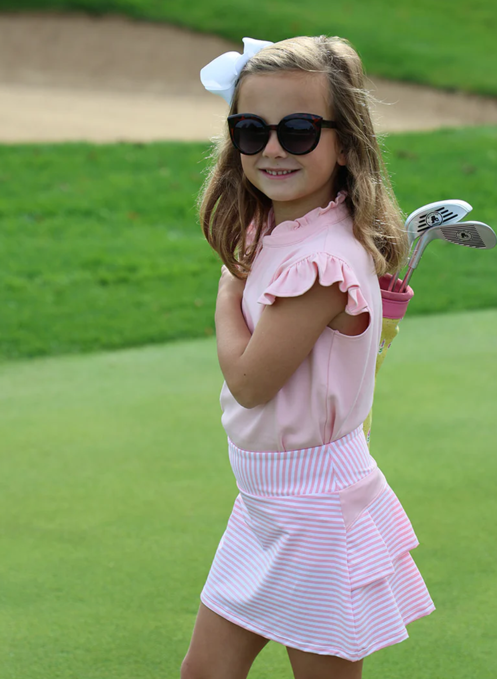 Our Prepletic™ Cindy Skort in Sandpearl Pink Stripe is a versatile skort that combines athletic functionality and Southern charm for active days that demand both style and movement. The built-in shorts provide confident coverage while the flattering silhouette transitions effortlessly from tennis courts to lunch dates to playground adventures. An essential for your active little one!