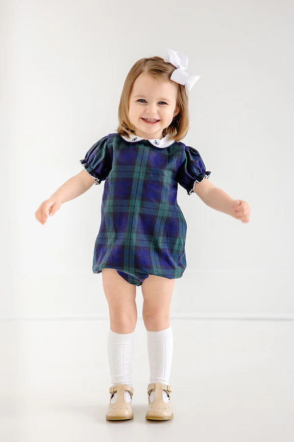 From the bow detailing on the collar, to the ruffle sleeve, our Bedford Bubble is sure to melt your heart. Featuring Berwick Black Watch with Worth Avenue White & Nantucket Navy Bows, this little bubble is sure to be darling on your little lady!