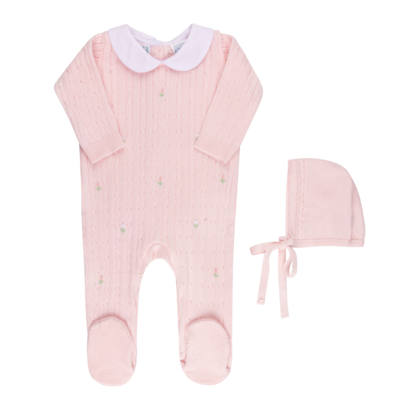 Looking for a classic knit set for your little one this season? Look no further than this warm and stylish baby girl set. Cable knit design with embroidered rosebuds on the front and a sweet white peter pan collar. Includes a hat.