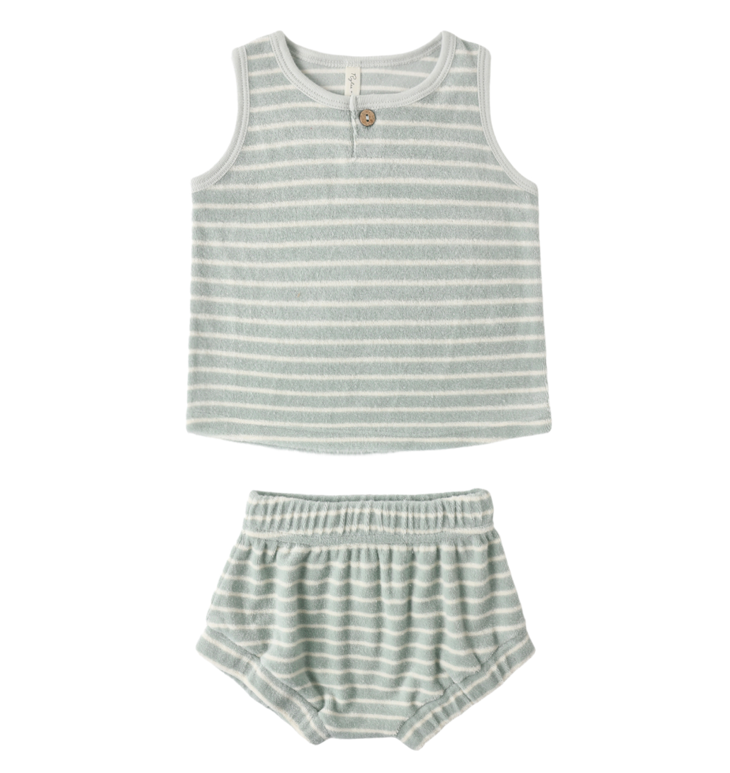 | This everyday terry cloth set comes with a tank top with button details, and coordinating bloomers with an elastic waist and legs. Featuring our ‘seafoam terry stripe' pattern. Enjoy sunny beach days in this retro look. Care: Machine wash cold. Tumble Dry low. Made of 85% cotton, 15% polyester |