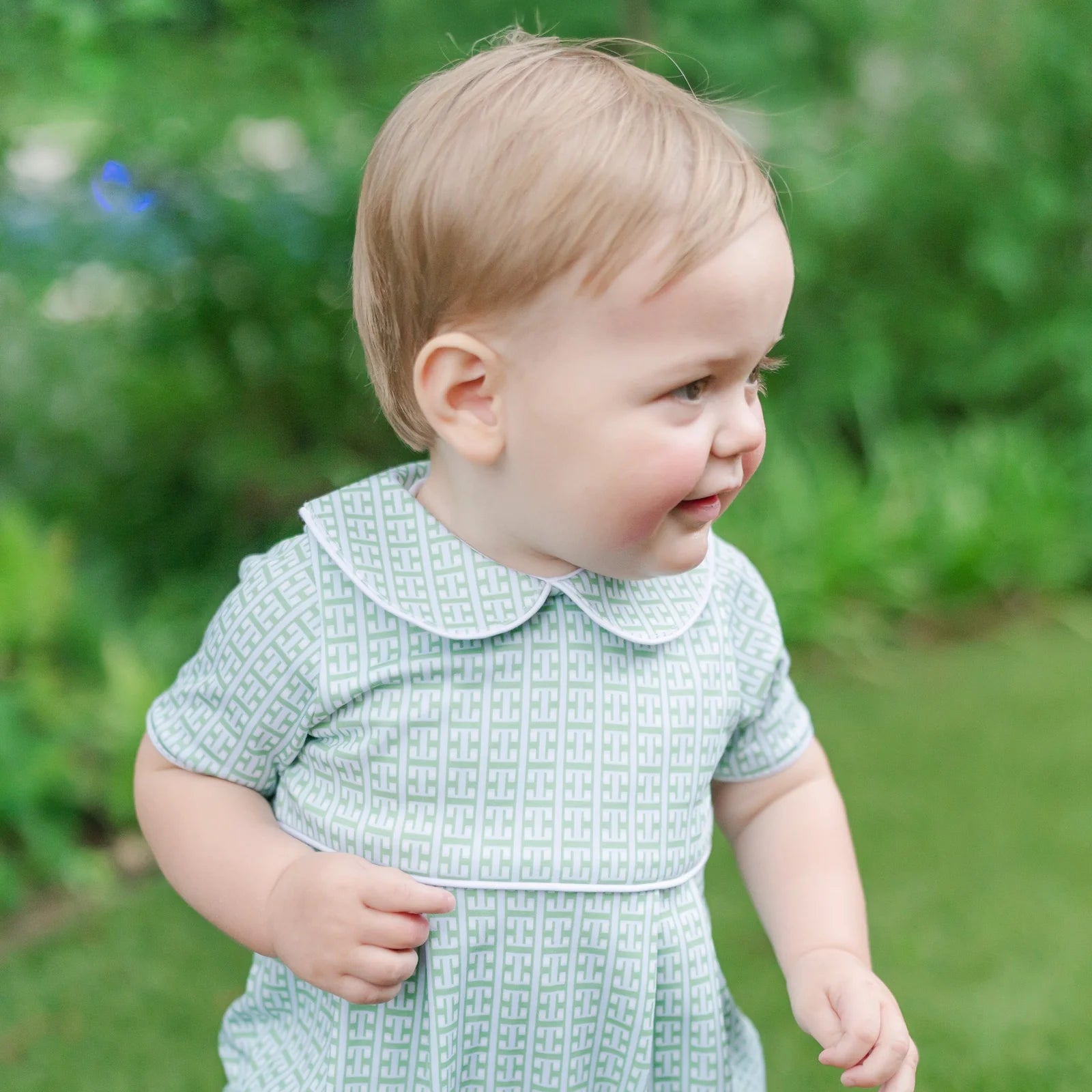 Boys' peter pan collar short sleeve pima bubble. Contrast piping on collar, sleeve and waist. Button closure in back and three snaps in the stride. Made from 100% Peruvian Cotton.