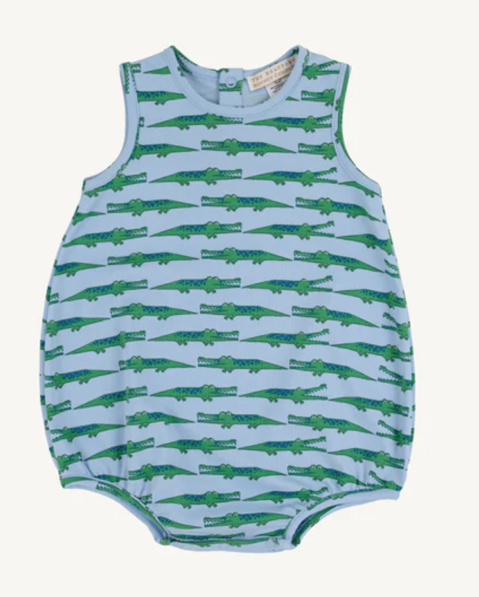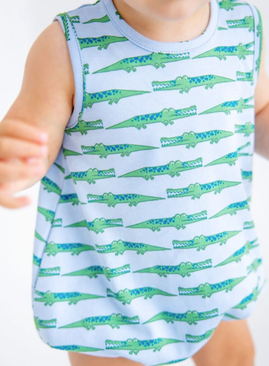 Watch your little one explore in style with our Patton Play Bubble showcasing the charming See Ya Later Alligator print in a sweet bubble silhouette. Perfect for active days filled with play, this comfortable one-piece offers easy movement and effortless dressing for busy mornings and spontaneous adventures. An adorable wardrobe staple that brings personality and polish to every moment, from birthday parties to backyard fun.