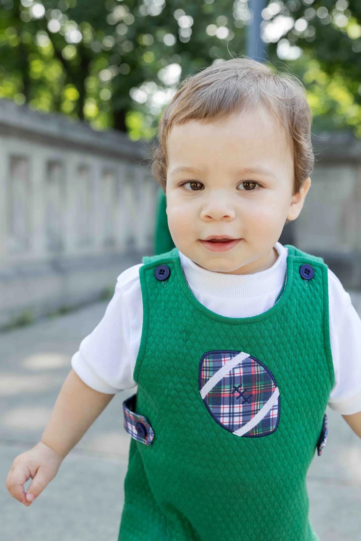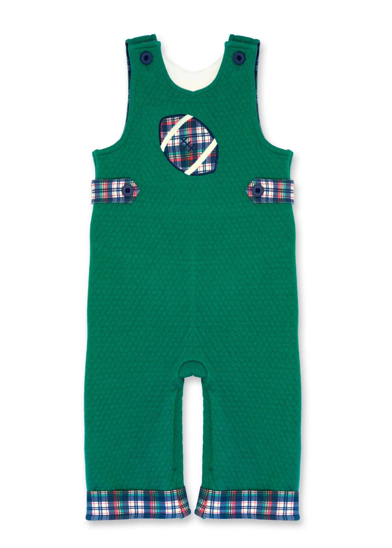 Tailored for picture-perfect fall moments, this textured green jacquard knit longall pairs cozy comfort with playful detail. Multi-color plaid side waist tabs and leg cuffs add a polished, seasonal touch, while an appliqué football brings in a dash of sporty charm.
