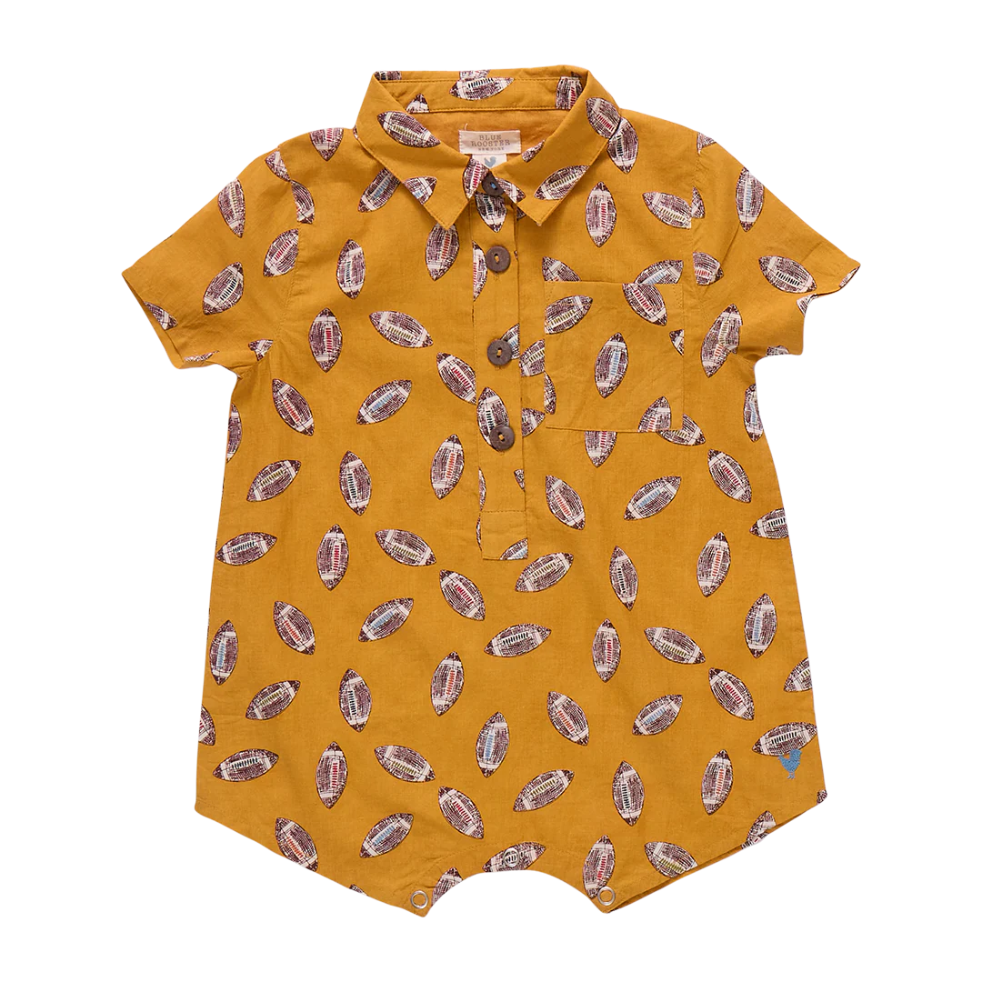 Friday Night Lights! Go out for a pass in our pep rally ready Baby Boys Easton Jumper crafted in our playful Flying Footballs print. Designer details on this handson one-piece include faux coconut buttons at the front and a pattern on pattern chest pocket. Ring snaps at the bottom allow for easy diapering.