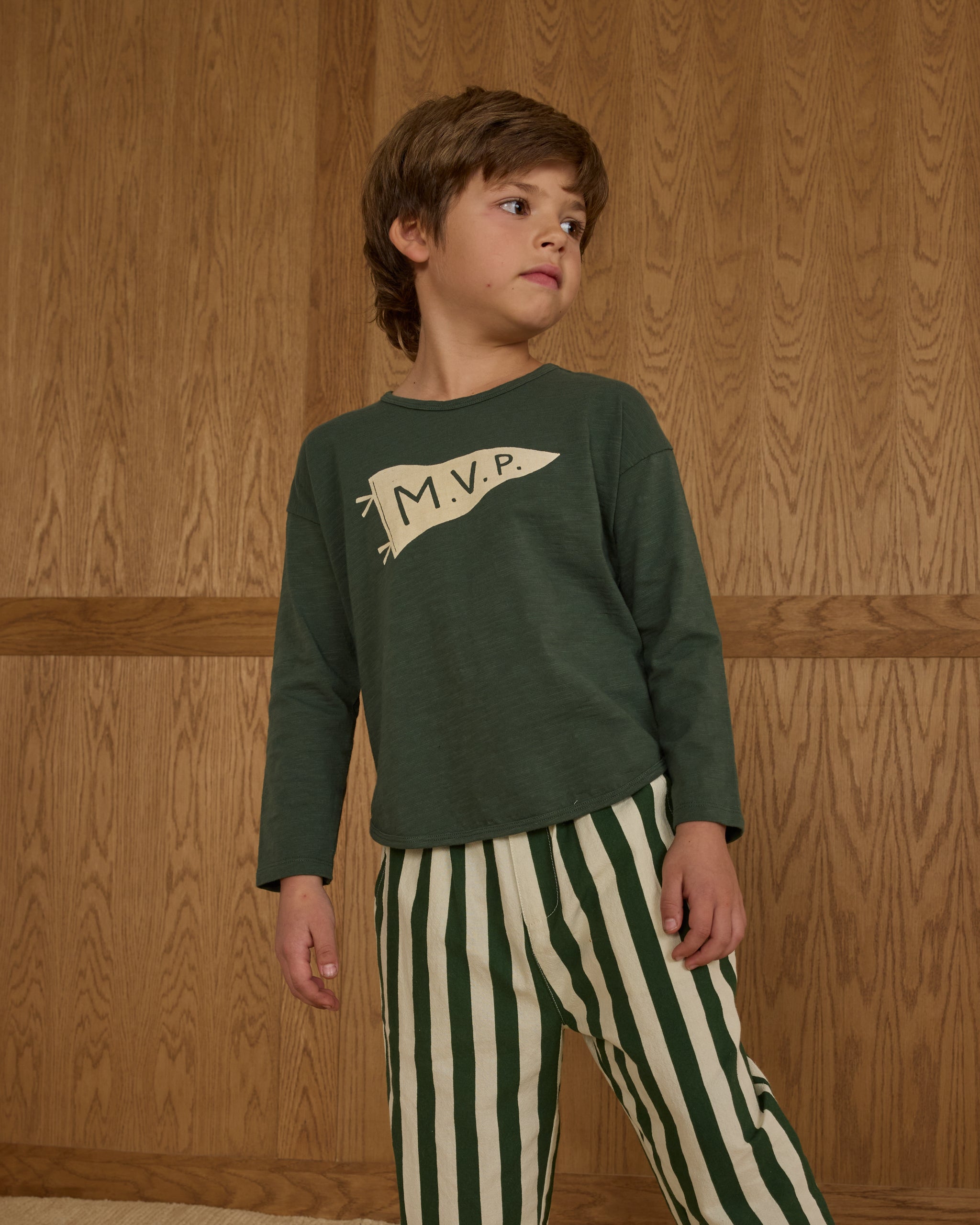 | Relaxed-fit long sleeve crewneck tee featuring a gently curved hemline. Shoulder snaps included on sizes 0-3M - 18-24M for easy changes. Featuring our 'mvp' spot print on our 'green' hue. Care: Machine wash cold. Tumble dry low. Made of 100% cotton. |
