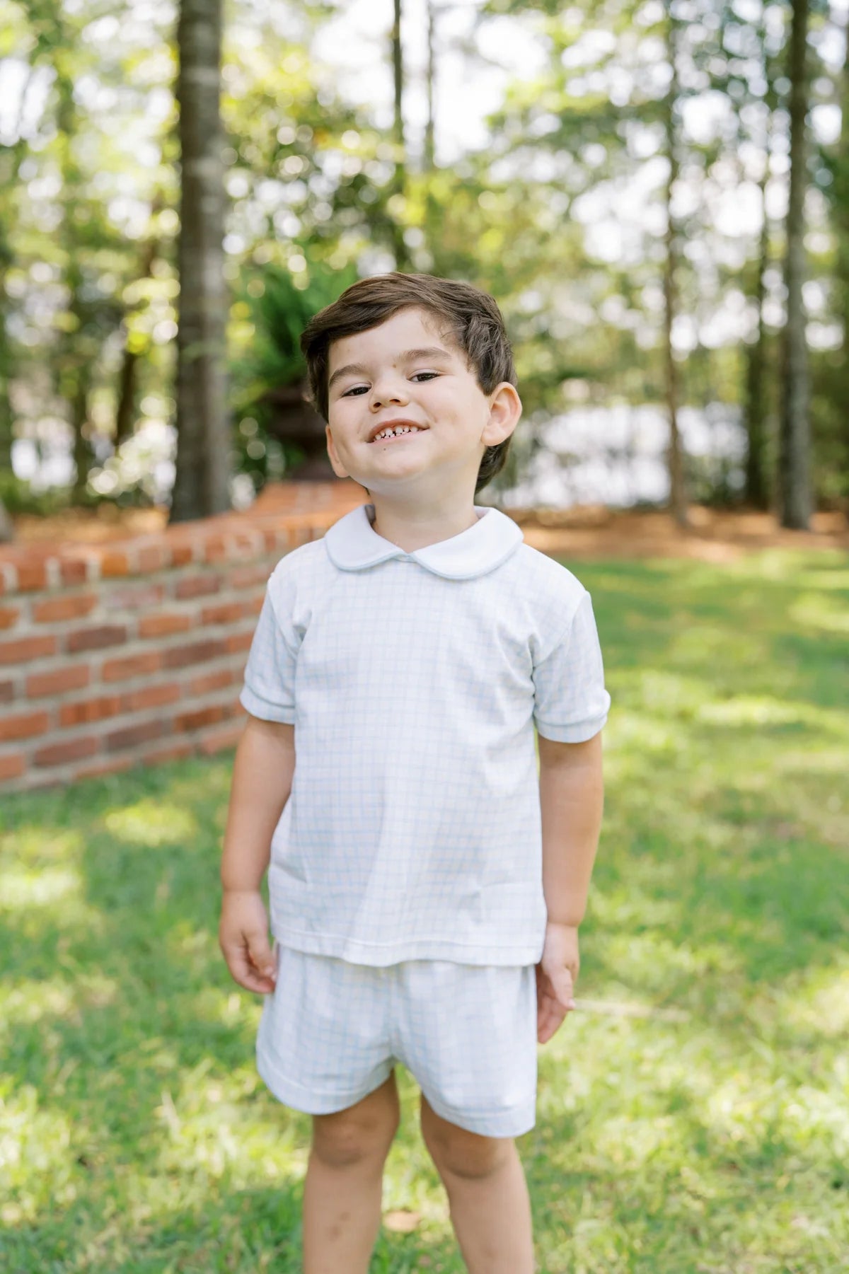 Classic charm meets playful detail in our Sibley Short Set. Made from a luxuriously soft Cornflower Check knit, this timeless top features a crisp white Peter Pan collar piped in light blue.