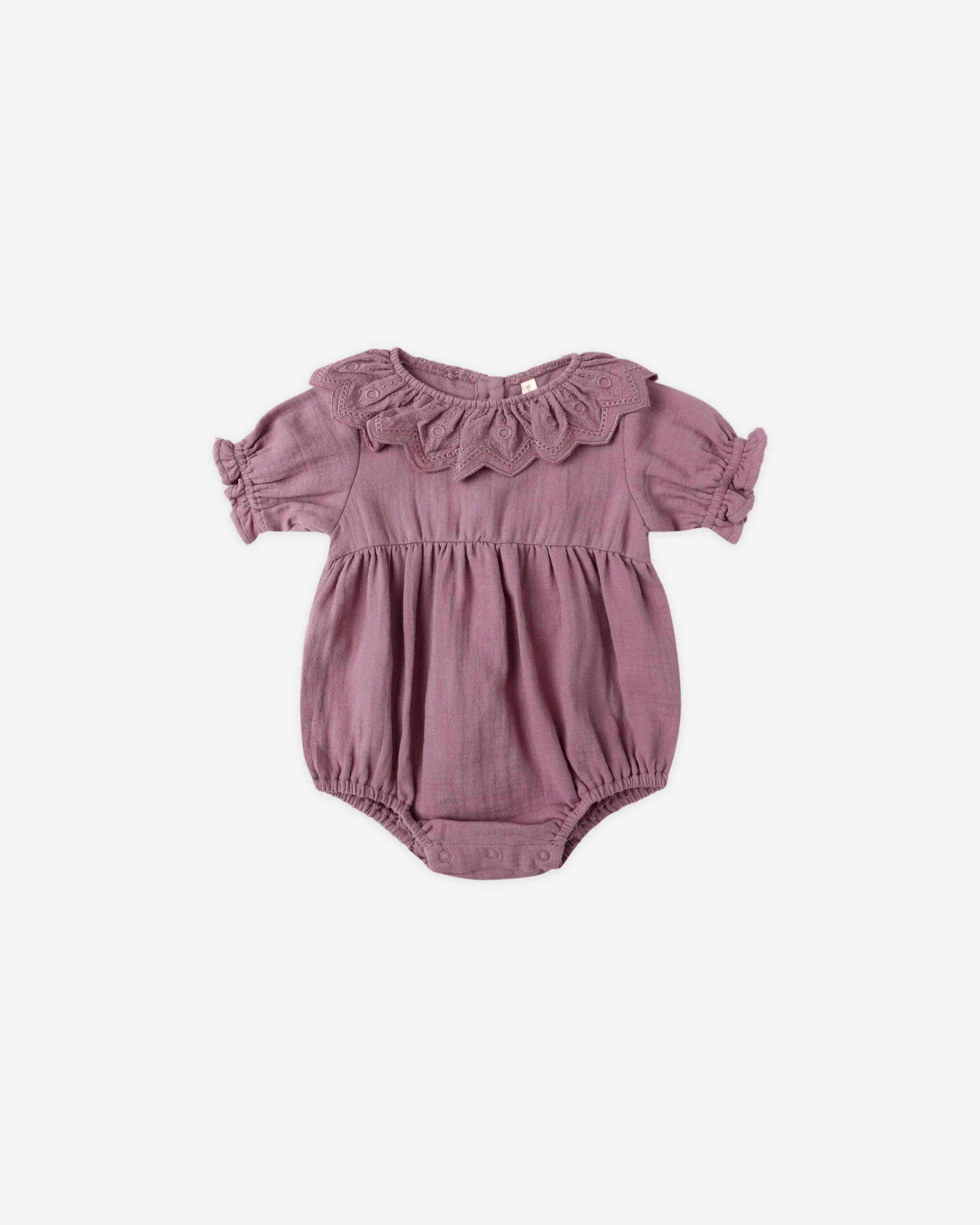 A sweet romper with a collar, short puff sleeves, and ruffle details, finished with back buttons and bottom snaps for easy changing.