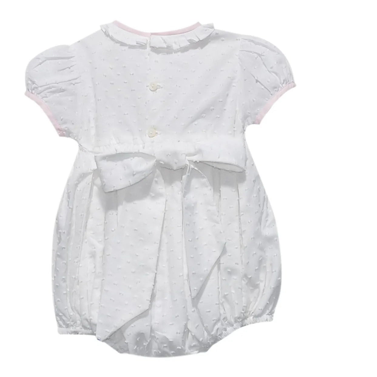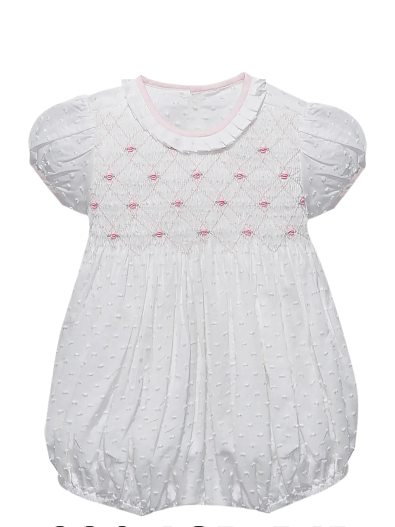 Indulge in the timeless elegance of the Juliette Bubble. This exquisite white bubble boasts intricate smocking details, ruffle neckline, and puff sleeves for a luxurious touch. Perfect for special occasions, this outfit will make your little girl feel like a sophisticated princess. Elevate her style with this beautiful masterpiece.