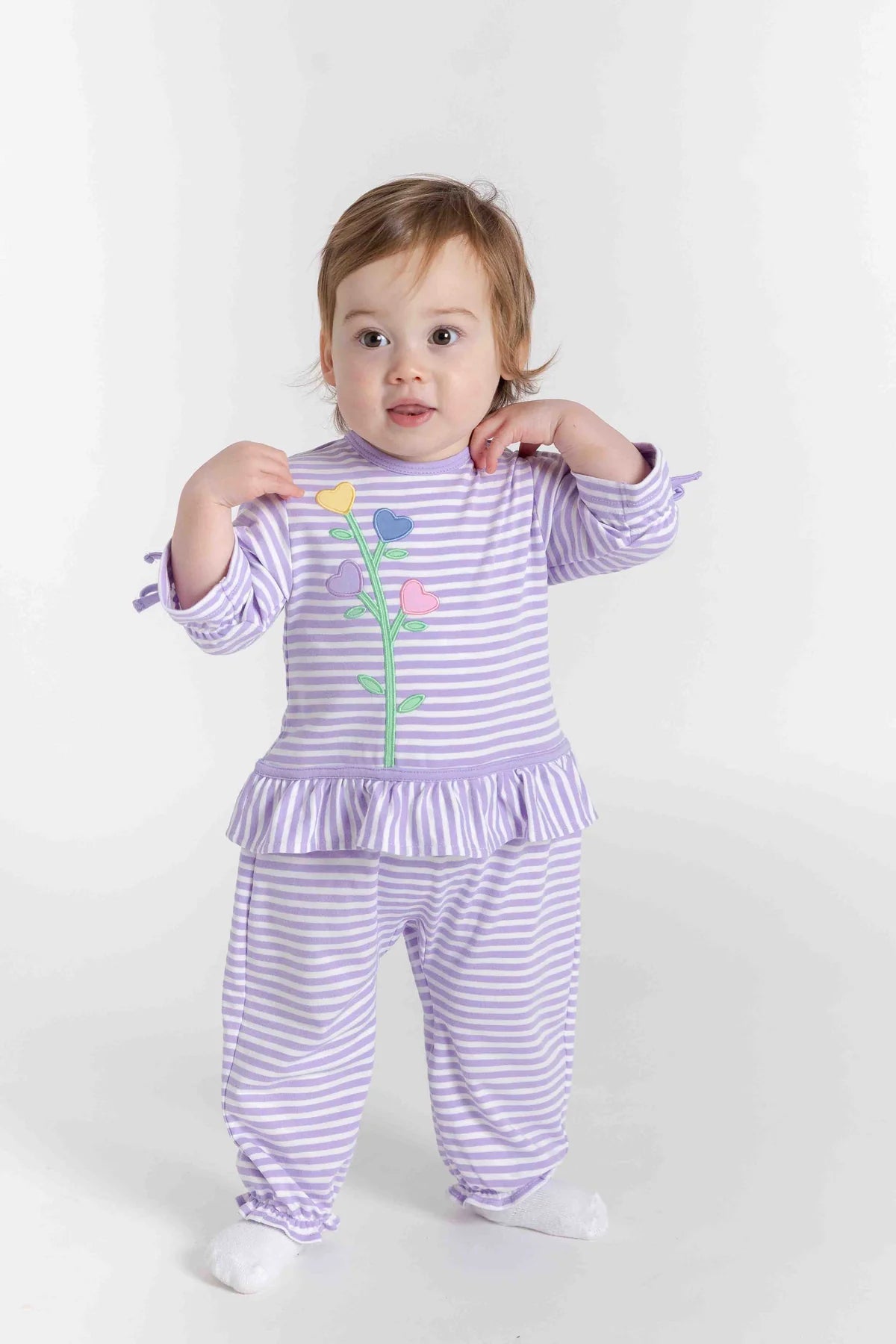 - Appliqué pink, yellow, blue, & lavender heart flowers on stem
