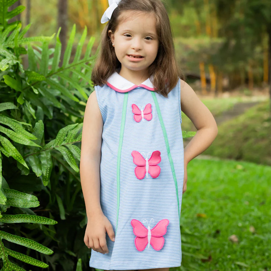 The Butterfly Jane Dress is a charming everyday favorite with a playful butterfly applique. Crafted from soft periwinkle bitty knit fabric, this dress offers comfort and flexibility while maintaining a polished look. The gentle periwinkle color makes it perfect for both casual outings and special moments.