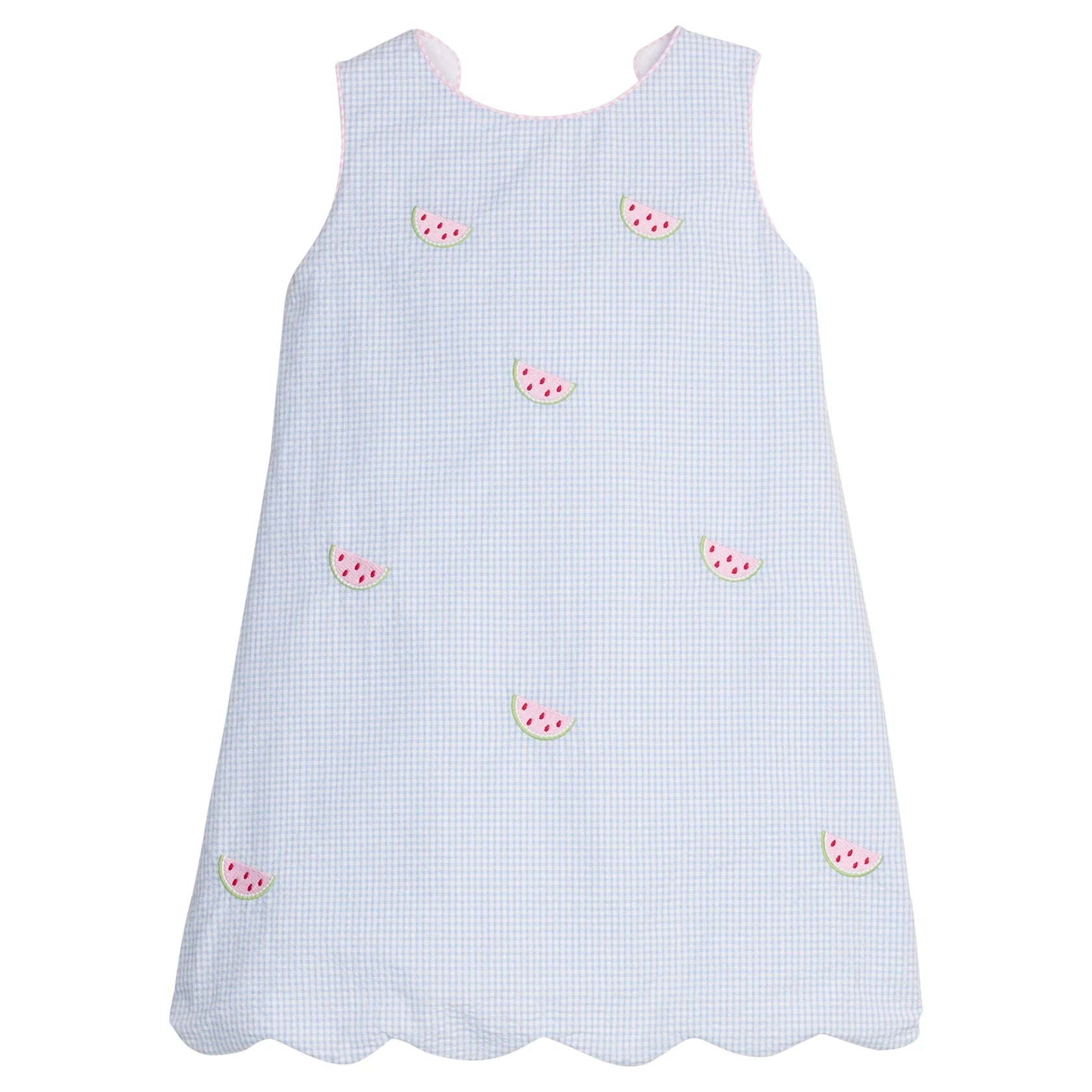 Our Bow Back Dress is a classic style featuring all-over watermelon embroidery set against a light blue seersucker gingham base with light pink seersucker gingham piping. A scalloped hem, fixed bow, and surprise watermelon embroideries one the back highlight the thoughtful detailing Little English is known for and makes this piece an extra special addition to your little girl's wardrobe.
