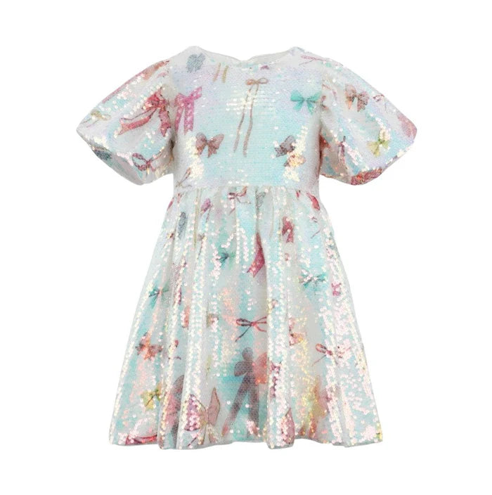 - Sparkling pastel dress featuring allover sequin overlay with whimsical bow and fairy wand prints