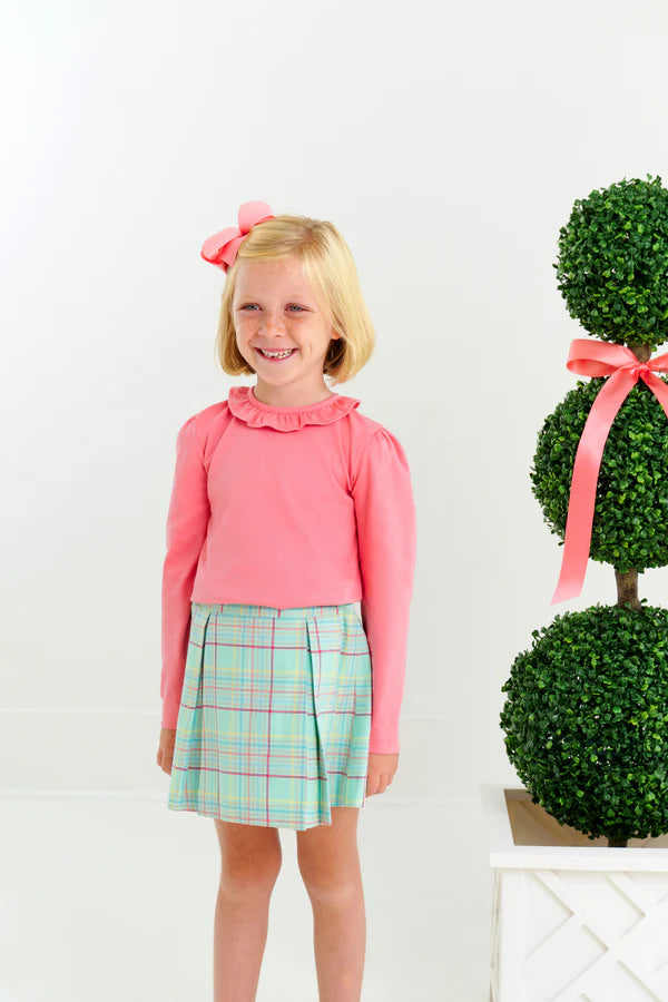 This sweet piece is essential to your girl's wardrobe! As the air grows crisp and cool, our Reece Ruffle Top in Parrot Cay Coral is the perfect way to layer this fall season.