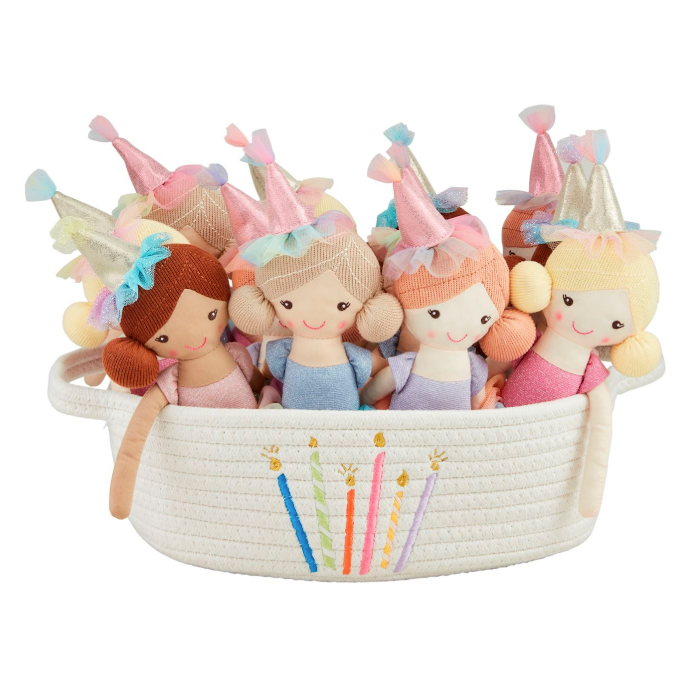 Faux linen doll features sweater knit yarn hair, party hat and rainbow mesh tutu skirt.