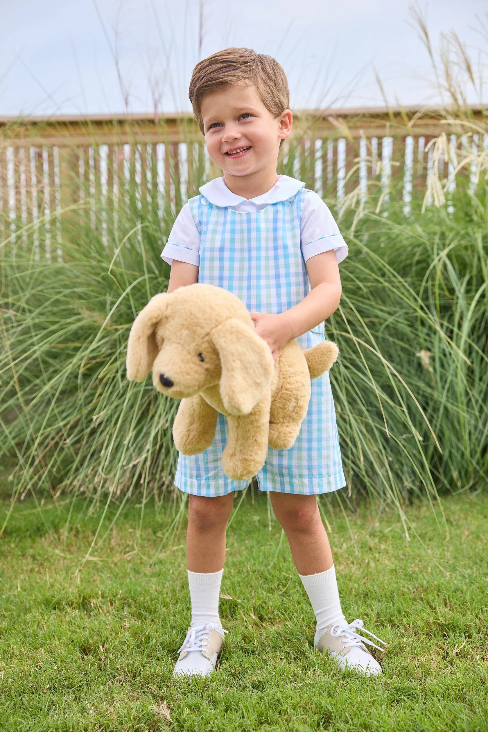 The Briarcliff Collection is a bright and cheerful collection featuring a charming blue and green plaid with vibrant aqua accents. The white, woven short sleeve peter pan shirt features contrast piping to pair perfectly with the plaid John John! Perfect for Easter celebrations and family photos, your toddler boy will love this happy and elevated set. Plus, sibling matches are easy with so many coordinating looks from our Briarcliff Collection!