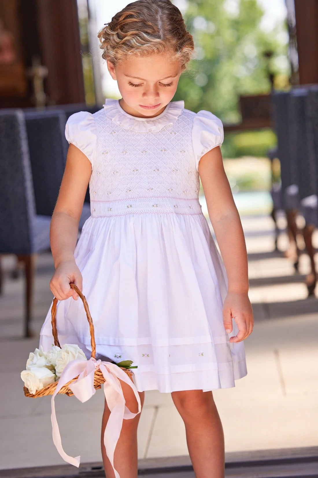 Looking for a dressier option for Easter? Our Smocked Claiborne Dress - Rosebuds is the sweetest silhouette for your little girl. Featuring a ruffled collar and capped sleeves, gorgeous smocking across the top with tiny pink rosebud detailing along the chest and at the hem, this dress is sure to impress for all your special Spring occasions